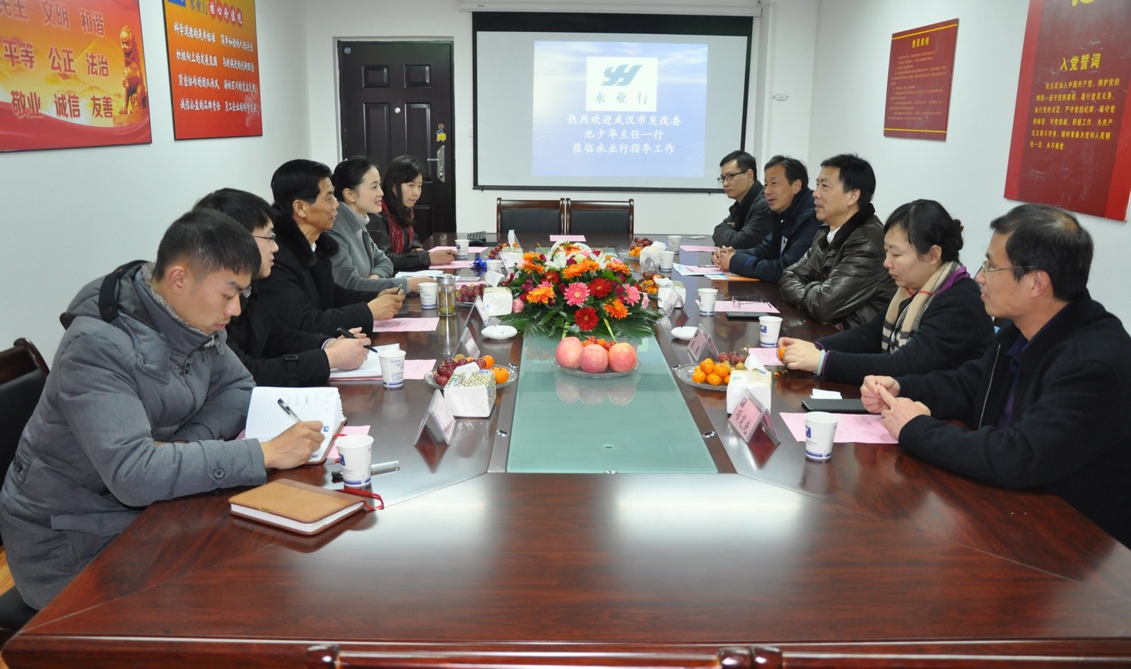2014年12月26日,武汉市发改委副主任池少华、环资处处长田雁、环资处正处级调研员兼市节能监察中心主任刘德权、市节能监察中心副主任项定先、环资处科长杨庆一行5人莅临永业行考察并指导工作。 公司董事长方国成、副总裁王琴及工程咨询部负责人文云波等相关人员热情接待了市发改委的各位领导。在观看了公司的宣传片后,方董向池主任一行介绍了永业行的发展历程和规模,王琴汇报了永业行在工程咨询和节能评估领域的业务开展情况。